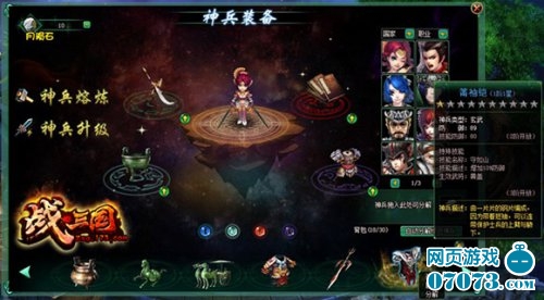 每名武将均可装备4个不同种类的神兵,点击神兵场景的装备按钮即可进入装备界面。进入界面后,从右侧列表中选中主角或武将,点击下方的神兵选择“装备”即可。