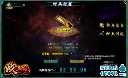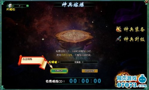 神兵通过熔炼获得,点击神兵场景的熔炼按钮即可进入熔炼界面。熔炼神兵需要特殊材料“月陨石”,如缺少月陨石,也可进行免费熔炼哟!免费熔炼每次会增加熔炉的温度,2小时后温度恢复正常;熔炉最高能承受5次连续熔炼,再次熔炼则需等待熔炉温度完全恢复正常。使用月陨石熔炼不会提高熔炉温度,消耗20 月陨石可立即获得神兵,无需等待降温;月陨石不足时,玩家可花费少量元宝购得。玩家选择任意方式,点击熔炼即可随机获得不同品质、不同种类的神兵。