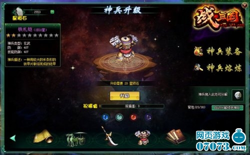 每个神兵都可进行升级,点击神兵场景中的升级按钮可进入升级界面。升级神兵需要消耗星陨石,星陨石可通过线上活动、竞技场荣誉商店兑换、元宝购买等多种途径获得。