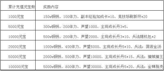 活动信息:在活动期间内,累计充值金额达到指定额度,即可领取对应奖励,每档奖励只可领取一次。