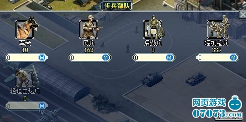 步兵:步兵、军犬可以进行侦查、其余兵种移动速度较慢、射程较短制造费用比较低适合与初级阶段进行攻击的一个手段、后勤兵可以运输少量物资,兵种战斗以后有几率升级。