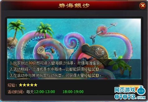 参加碧海银沙活动,在沙滩及水中均可获得丰厚经验,还可以通过与其他玩家互动每次都会获得经验奖励。