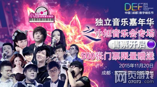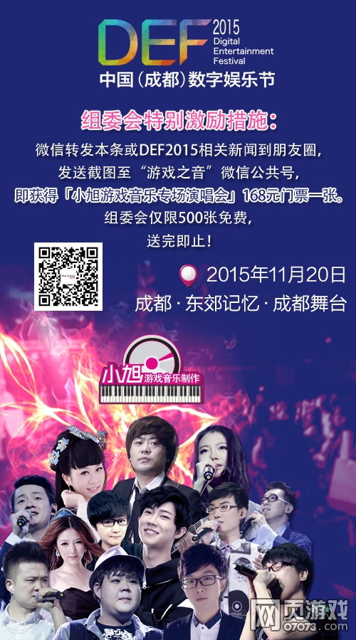 数娱盛宴「DEF2015」开幕在即,小旭音乐会专场坐镇「独立音乐嘉年华」炫目亮相DEF2015。组委会特别制定激励措施:微信转发本条或DEF2015相关新闻到朋友圈,发送截图至“游戏之音”微信公共号,即获得「小旭游戏音乐专场演唱会」168元门票一张。组委会仅限500张免费,送完即止!伙伴们快准备好喽?赶紧刷起来!