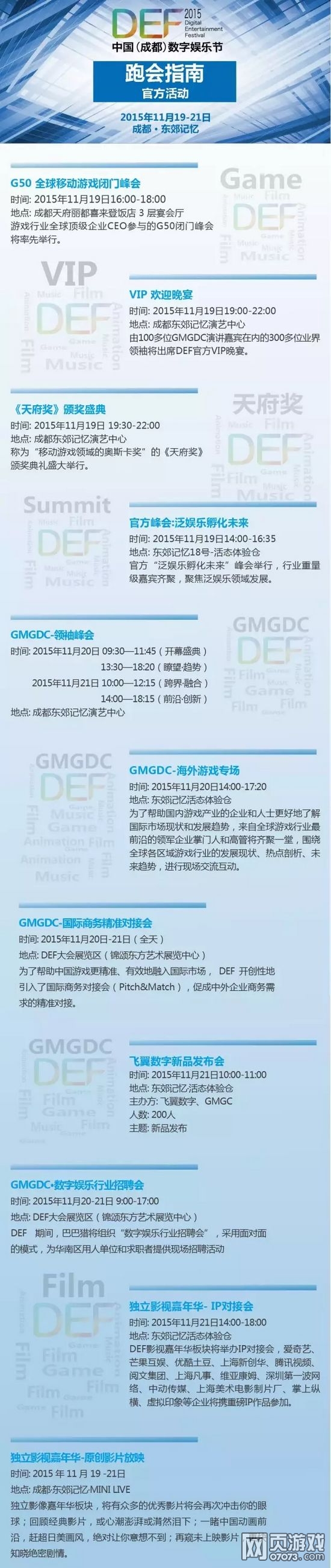 11月19日,中国(成都)数字娱乐节(DEF2015)在成都东郊记忆盛大开启,DEF期间将有大量同期会议活动,为了方便广大参与群众,组委会特此为大家整理展会期间的跑会指南!本次指南分为四大项: