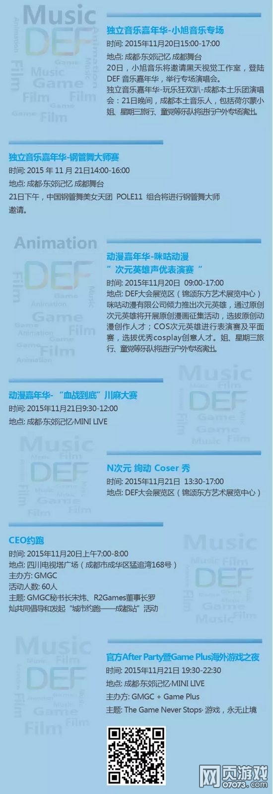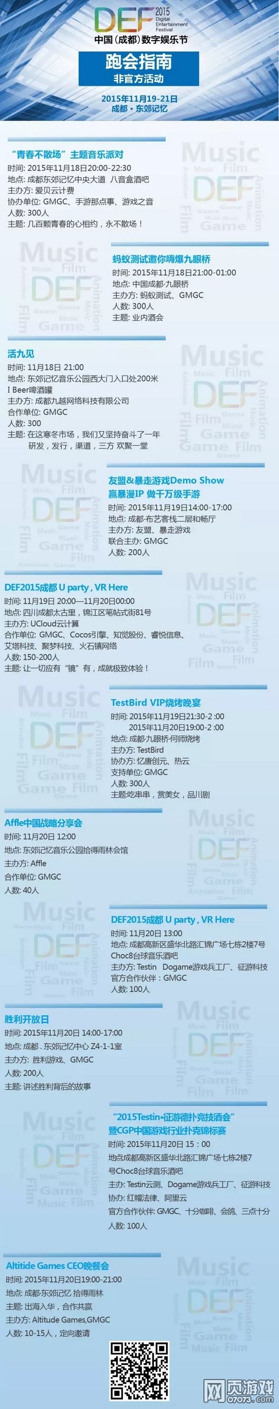 包括:“青春不散场”主题音乐排队、“蚂蚁测试邀您嗨爆九眼桥”、“胜利开放日”、“活久见”、“”“友盟&暴走游戏Demo Shoe 赢暴漫IP 做千万手游”、“DEF2015成都U party,VR Here”、“TestBird VIP烧烤晚宴”、“Affle中国战略分享会”、“2015Testin·征游德扑竞技酒会”、“Altitide Games CEO”等十一大项;