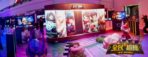 在CJ2015现场,《全民超神》展区位于展区内N2-06,因为这款游戏能让玩家随时随地享受MOBA开黑体验,现场展区在布置上也充分考虑到对抗元素,直接将游戏推塔场景在展区重现。以河道为界限的红、蓝两区,各自拥有红色或蓝色的防御工事(城墙、防御塔等),设置的试玩区也是红、蓝对立。除此之外,展区还有大屏幕用以播放演示视频,直播竞技对抗等。