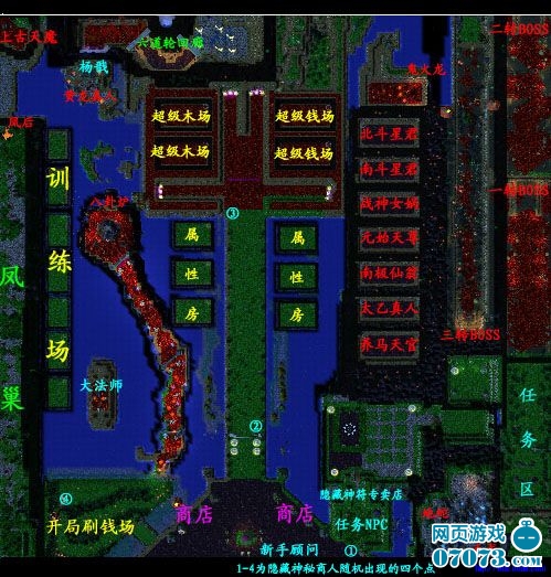 共设3个普通训练场、2个普通钱场和木场、2个超级钱场和木场、6个属性房+五大属性BOSS