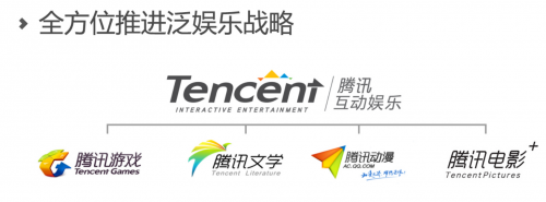 在游戏领域,腾讯目前已成为全球游戏用户和收入规模第一的公司,在此基础之上,腾讯一方面从外部引入如《火影忍者》《复仇者联盟》、《火影忍者》、《中国好声音》、《仙剑奇侠传》等来自动漫、影视、综艺等各领域的明星IP进行游戏改编等泛娱乐延展,另一方面,也重视对IP的培育和塑造。如根据古龙经典小说改编的同名游戏《天涯明月刀》,聘请陈可辛、袁和平、奚仲文、吴里璐四大香港电影宗师级人物参与游戏研发,用电影的手段去打造精品游戏;而拥有亿万玩家的《QQ炫舞》游戏,也在去年通过挖掘其自身明星IP价值,从线上游戏走向线下舞蹈比赛,从虚拟走向现实,在线下比赛的同时也通过炫舞梦工厂平台进行网络直播,真正实现舞蹈比赛和炫舞玩家线上线下的联动。