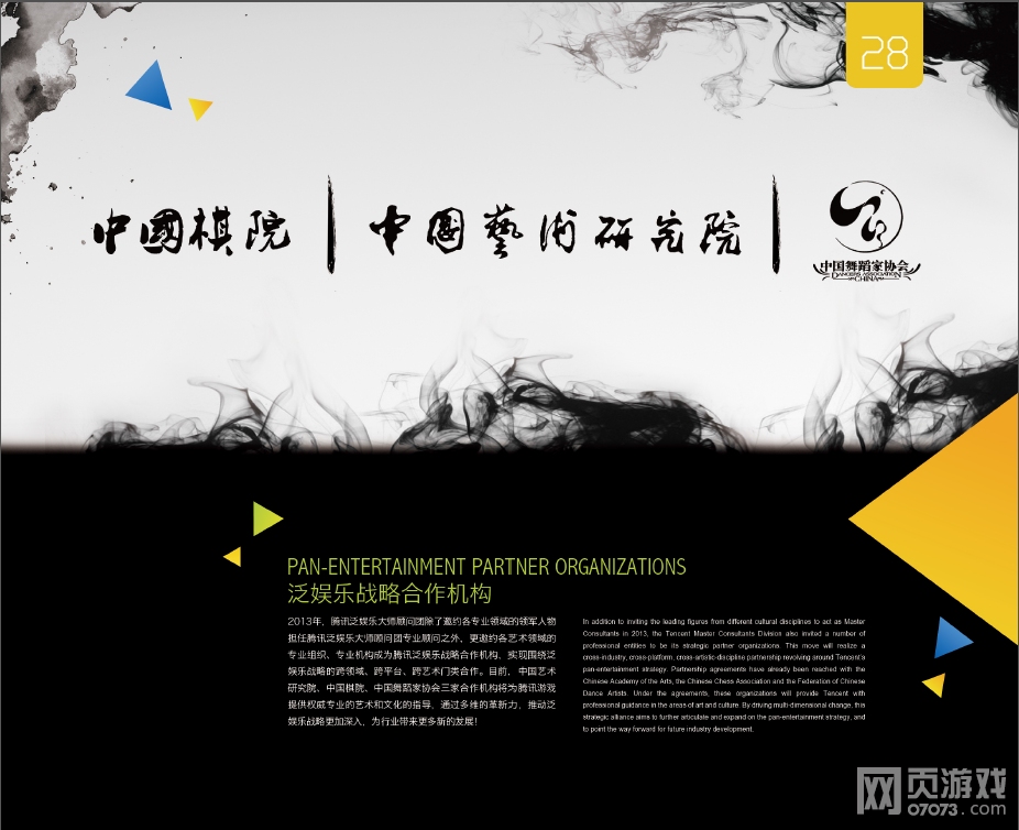 以IP为核心不断拓展泛娱乐业务同时,腾讯互娱还与中国艺术研究院、中国舞蹈家协会、中国棋院等多个权威专业机构以及莫言、谭盾、蔡志忠、陈可辛、苏童、阿来、陈可辛等名家展开积极深入的艺术合作,成立大师顾问团,致力于打造民族文化精品和明星IP,让想象绽放,构建泛娱乐健康新生态。