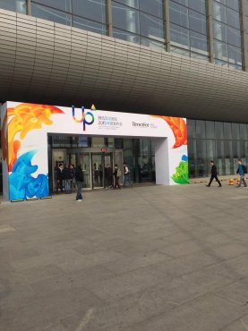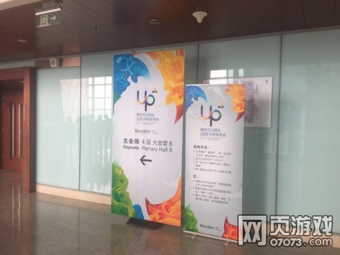 一走出地铁口,就看到UP2015腾讯互娱发布会的大门牌,相当帅气有木有。门牌上的四种色彩分别代表了互娱的四项业务,分别是游戏、文学、动漫,还有全新起航的电影业务。
