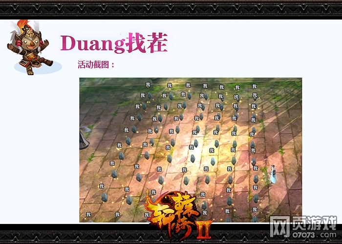 《轩辕传奇2》“冲上云霄”版本愚人节惊喜再升级,Duang找茬行动发布!活动期间,玩家可以在日常活动中领取入场券,持入场券从NPC进入找茬副本;找茬活动为5分钟,将刷出众多物件,大部分名字和表现ID一样,只有唯一一个是不同的。玩家要在指定时间内,完成八轮挑战,可得到所有的奖励。若时间结束,则停止刷物件,且清除当前轮的物件。眼花缭乱的名字犹如加了特效一般,Duang!Duang!Duang的出现在玩家面前,谁能快速找到目标字眼?
