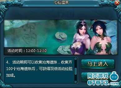 当玩家等级达到XX级后,每天12:00-12:30可以进入七仙温泉,温泉里面有不同的仙子,而且可以进行互动游戏,你可以想像在温泉里面的穿的东西都是很少的哦!泡在温泉里面你不用做任务和打怪都可以加大量的经验,在活动期间可以收集沧海遗珠,收集齐100个沧海遗珠后,可以获得双倍活动经验加成。