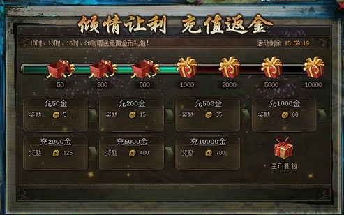 2、活动期间玩家累计充值达到每个奖励档次均可获相应的金币返还;