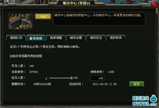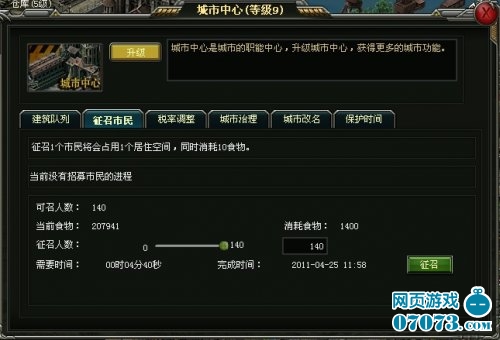 当您的人口上限足够大的时候,您可以点击建筑“城市中心”,在城市中心的面板中选择“征召市民”,在“征召市民”菜单中,选择拖动条或者填入,想要征召的人口数量,再点击“征召”,您的人口就被征召到了您的城市,可供调动,用来配备军队或者充当建造生产的工人。