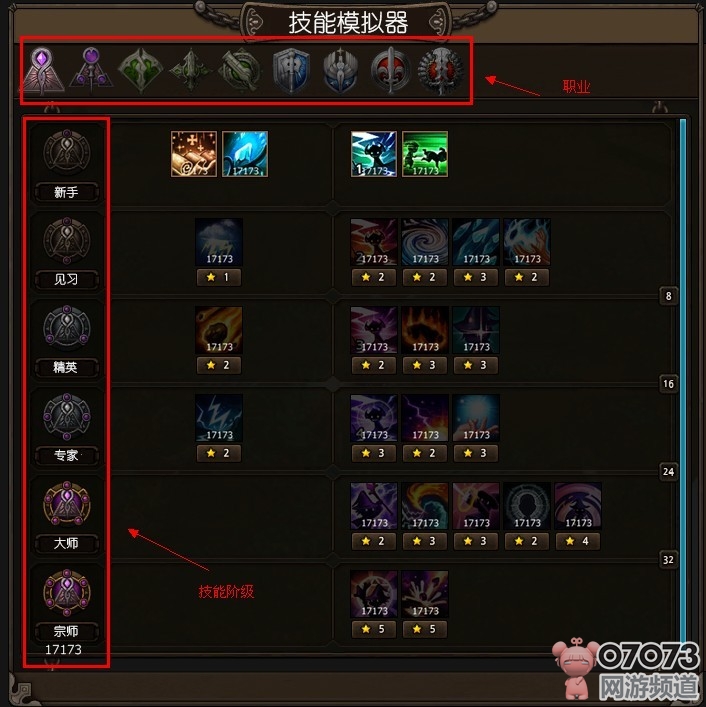 职业阶级共有6个阶段,分别是:新手、见习、精英、专家、大师、宗师(暂译)。职业阶级越高,学习到的技能会越强大,所以,为了能学习到更强大的技能,必须要提升职业熟练度.